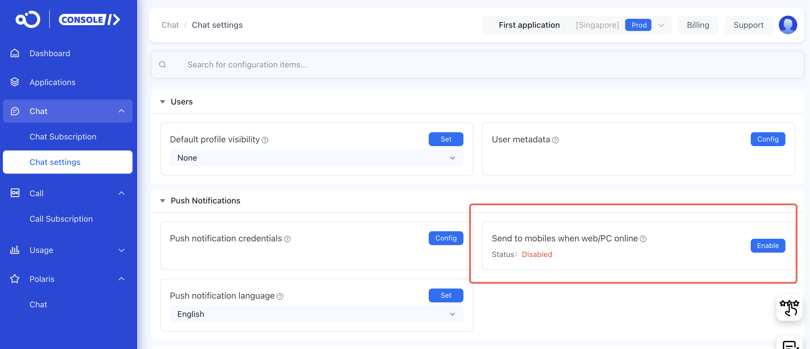Go to the Chat settings page in the console, confirm that the correct application name and environment (Development/Production) are selected, and then click Enable.