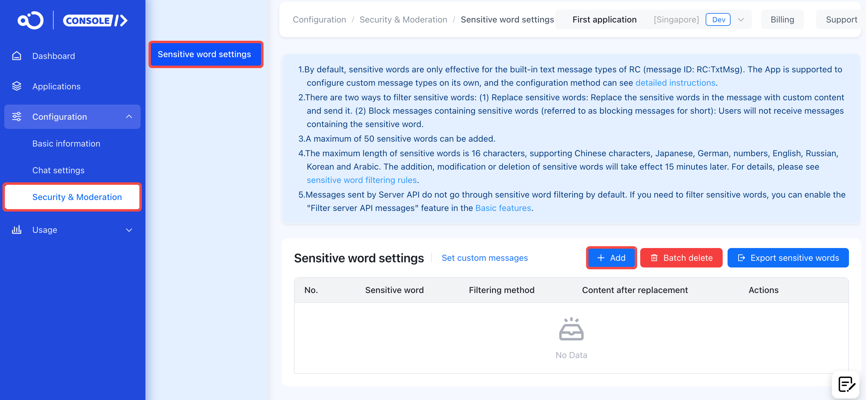 RC Chat provides a built-in sensitive word feature. This guide shows how to set it up in the Console. Supported languages for filtering include: Chinese, English, Japanese, German, Russian, Korean, and Arabic.