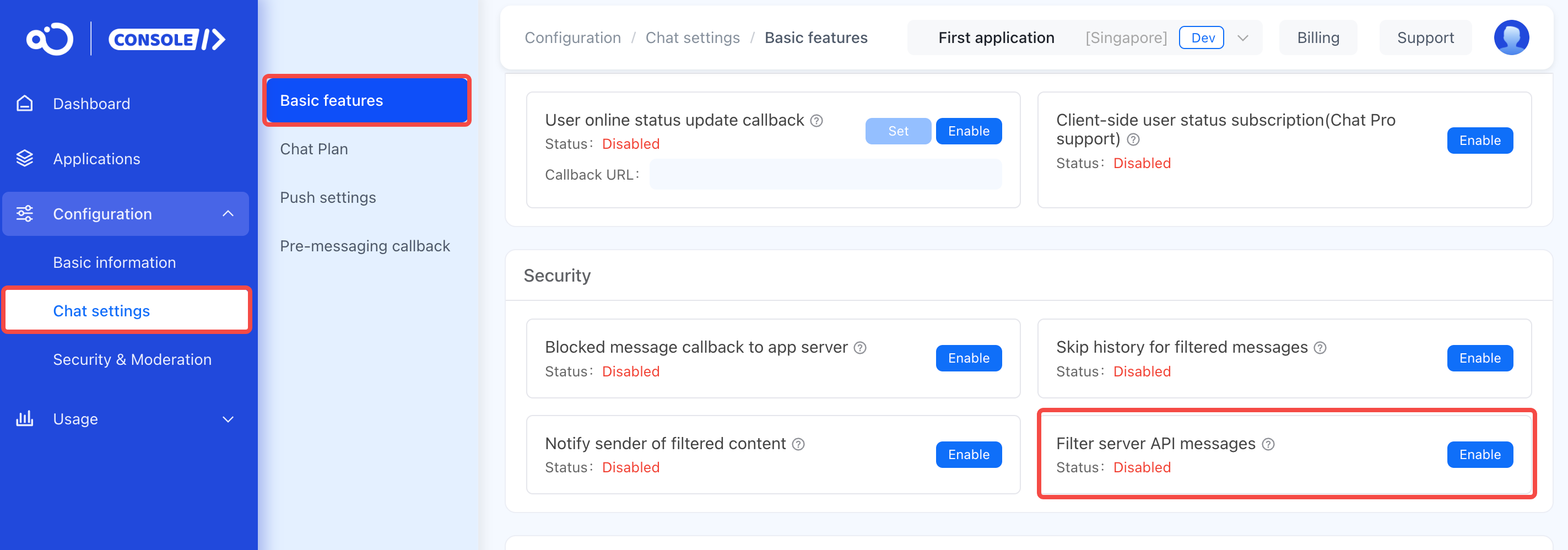 By default, messages sent via the server API arenât filtered. To enable it, go to the Basic Features section in the Console and turn on Filter server API messages.